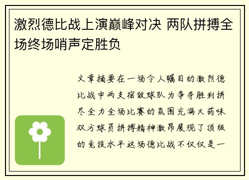 激烈德比战上演巅峰对决 两队拼搏全场终场哨声定胜负
