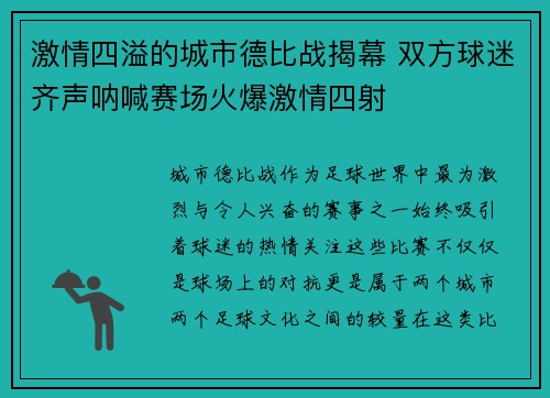 城市德比战,作为足球世界中最为...